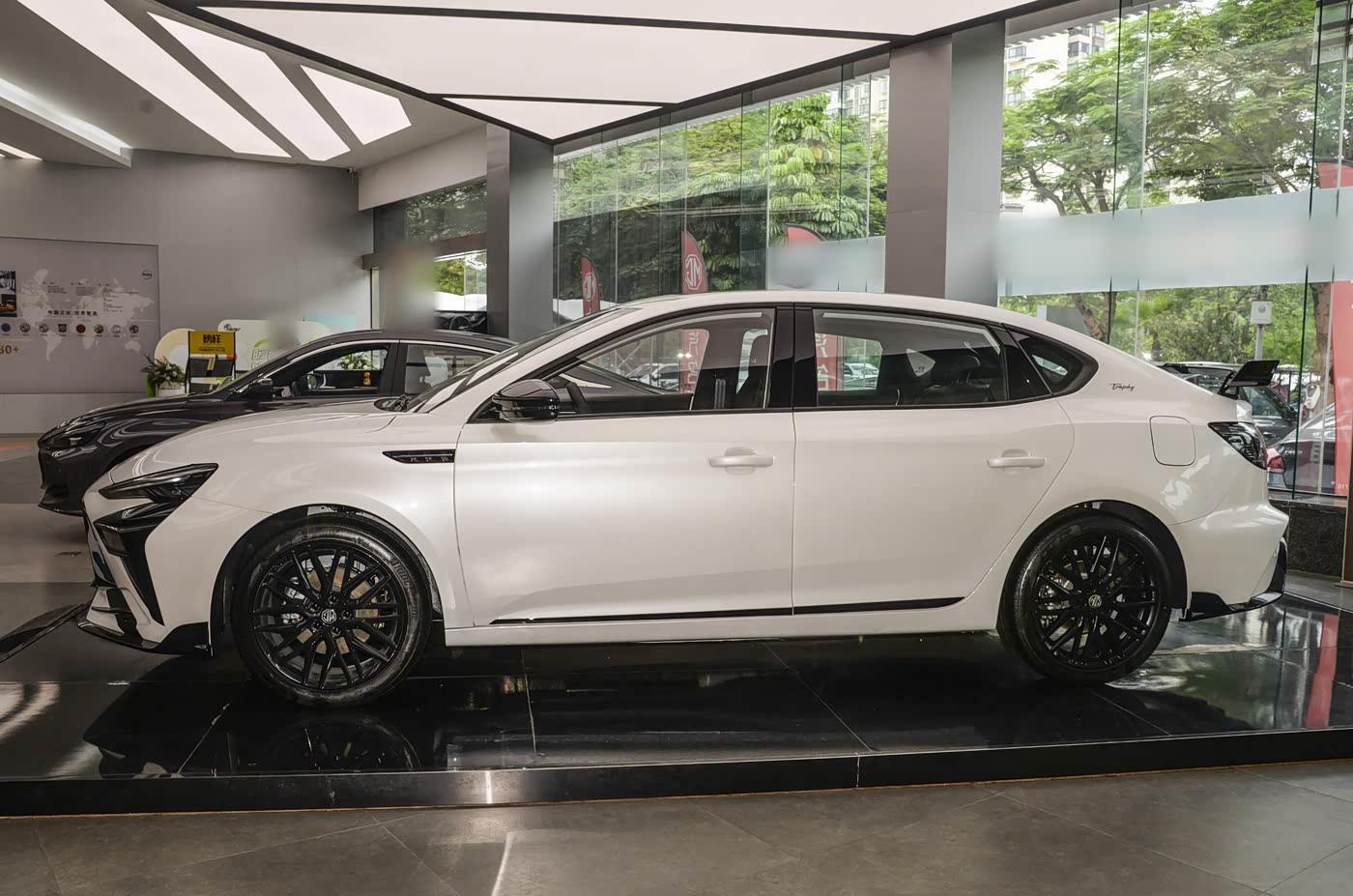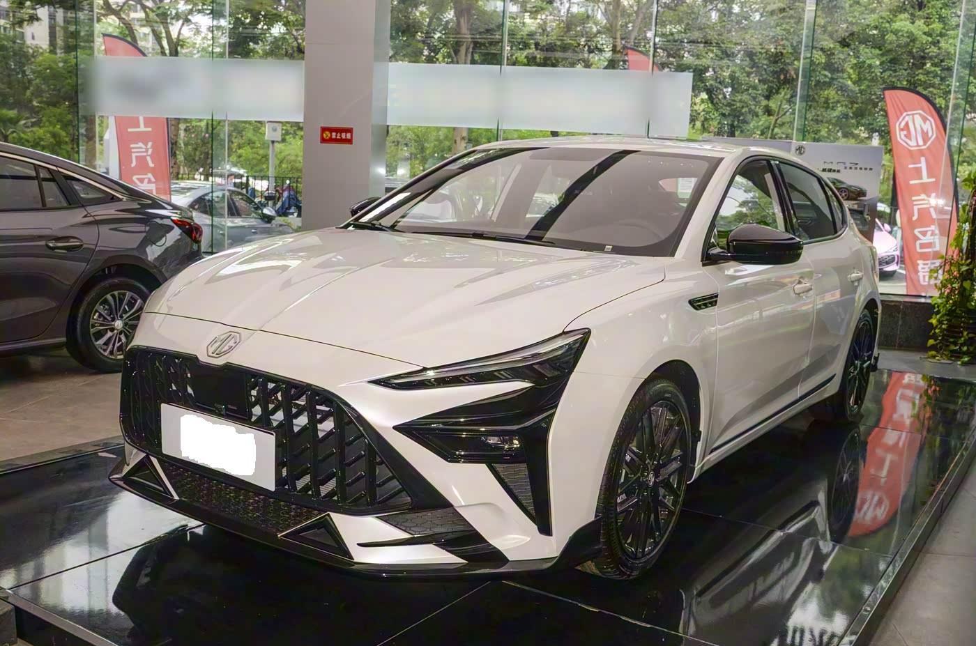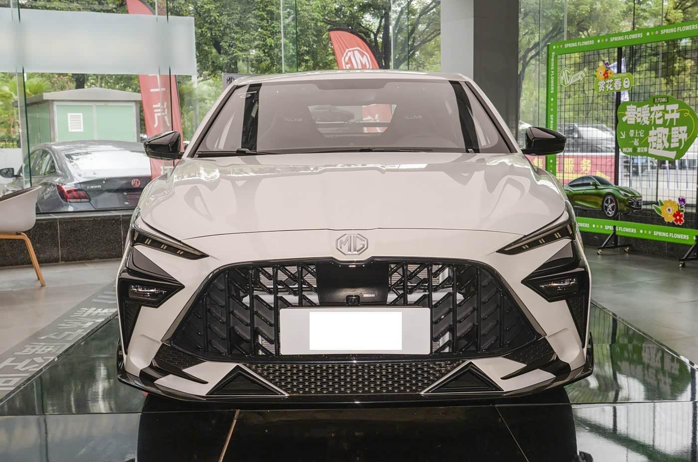 我们首先来看新车的外观设计方面,新车的前脸采用大尺寸星辉骑盾格栅,内部黑色蜂窝状设计配合MG徽标,形成强烈的视觉纵深。分体式LED大灯组造型犀利,灯腔内部采用多颗LED光源排列,夜间辨识度极高。前保险杠两侧的导流槽设计与底部梯形进气口形成“X”型布局,搭配冷峻的机盖棱线,营造出猎豹俯冲般的攻击性。值得注意的是,新款取消了珠光黑配色,仅保留珠光白与鲨鱼灰两种车漆,进一步强化运动属性。